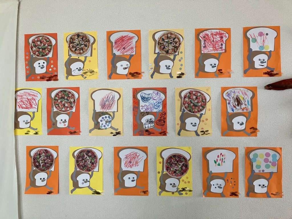 テーマは絵本の「パンどろぼう」です。食パンに好きな飾りつけをし、顔も皆シールとクレヨンでデコレーションしてくれています。個性があふれていて、みんな素敵な作品に仕上がりました!6月の制作も楽しみにしていてくださいね!