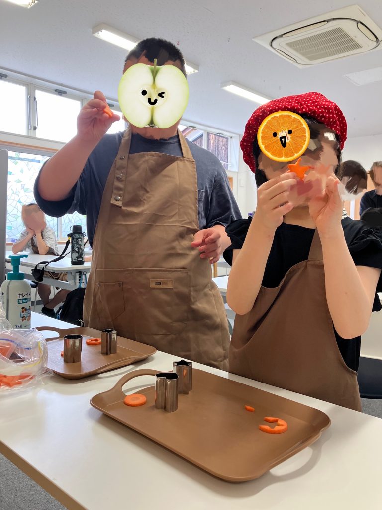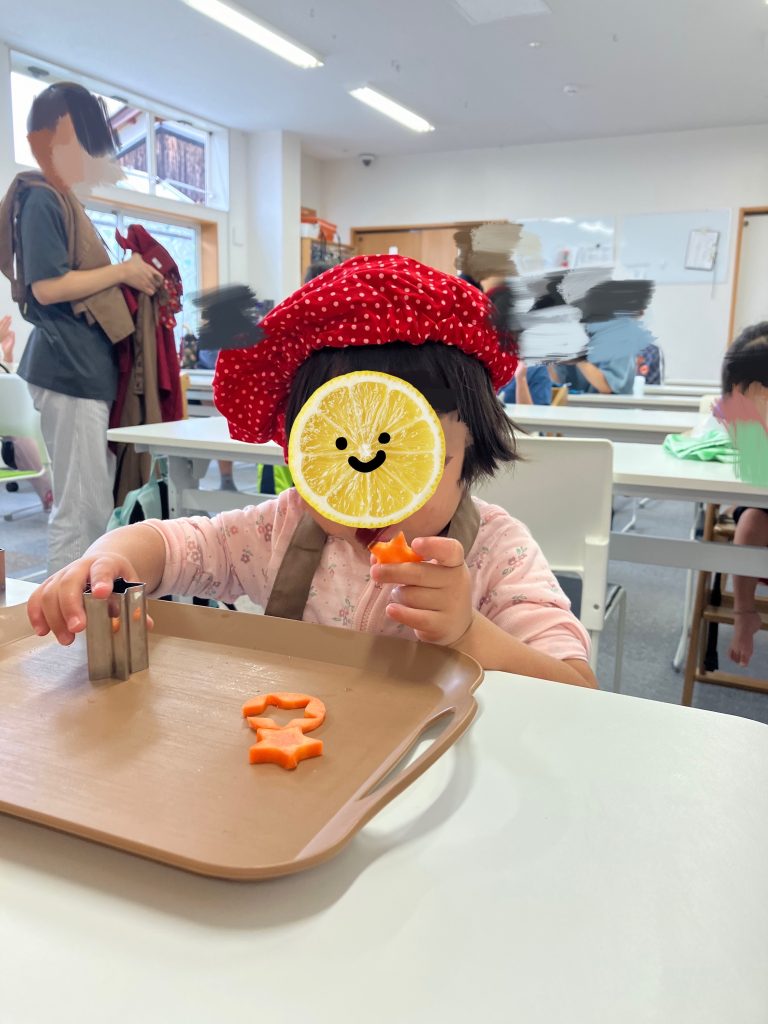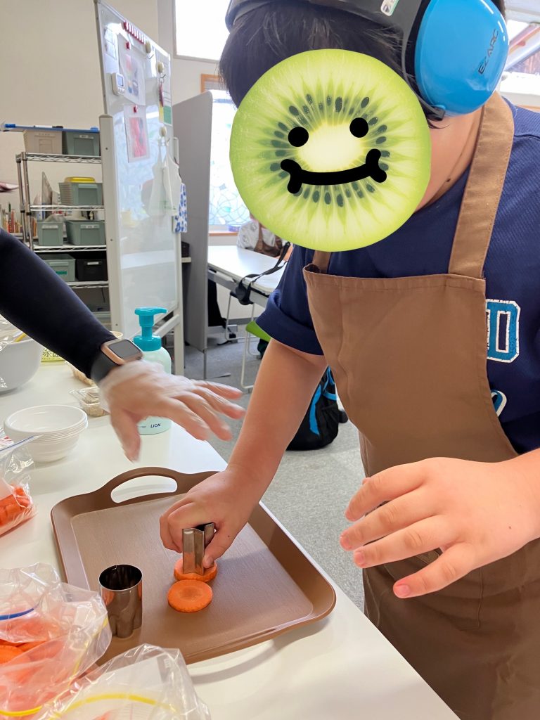 まずは人参をクッキーの型を使って可愛い形にします。ちょっとかたいけど、みんな頑張って型抜きしてくれました!