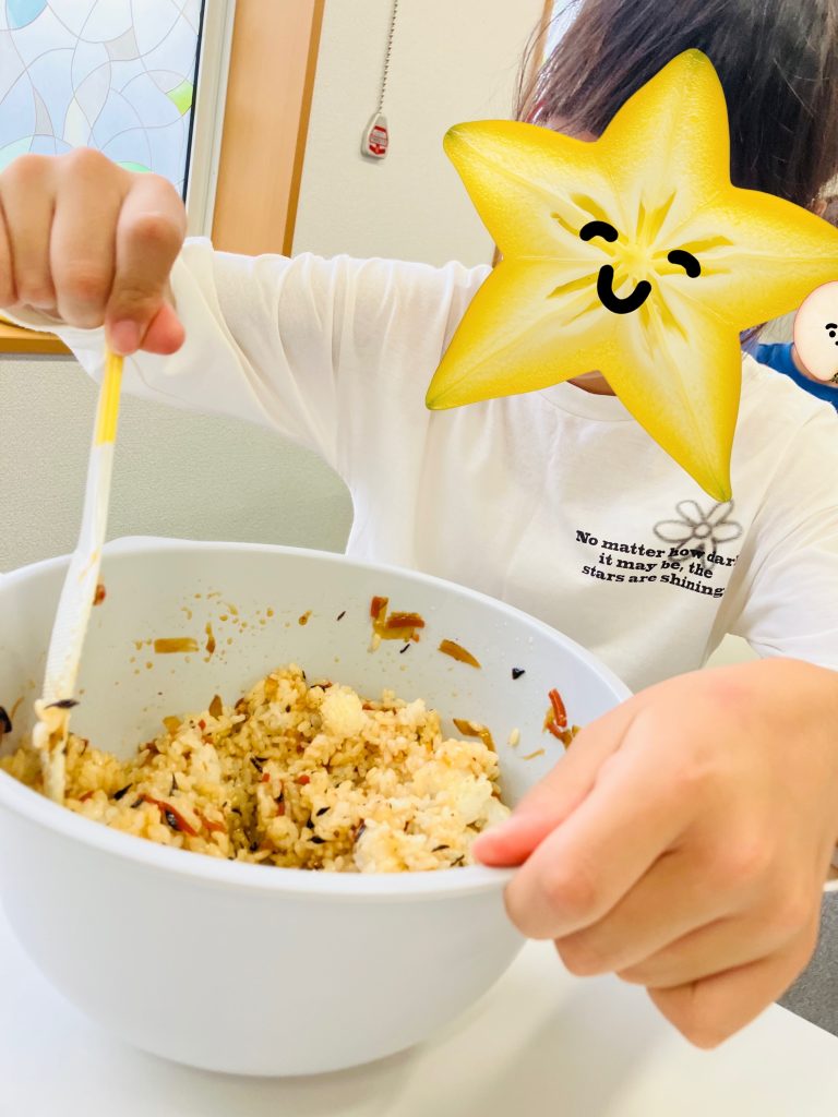 お次は混ぜご飯をみんなで協力して混ぜます。ん~!だんだんいい匂いがしてきた!