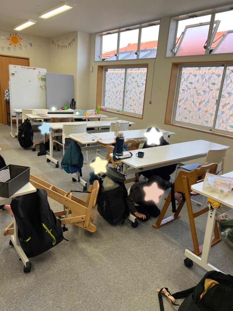 避難訓練では、地震を想定しアラーム音が鳴るところから始まりました。びっくりしている子もいましたが、みんな机の下に隠れ、実際の避難場所であるコミセンまで車で全員が移動できました。みんな頑張ってくれてありがとう!
