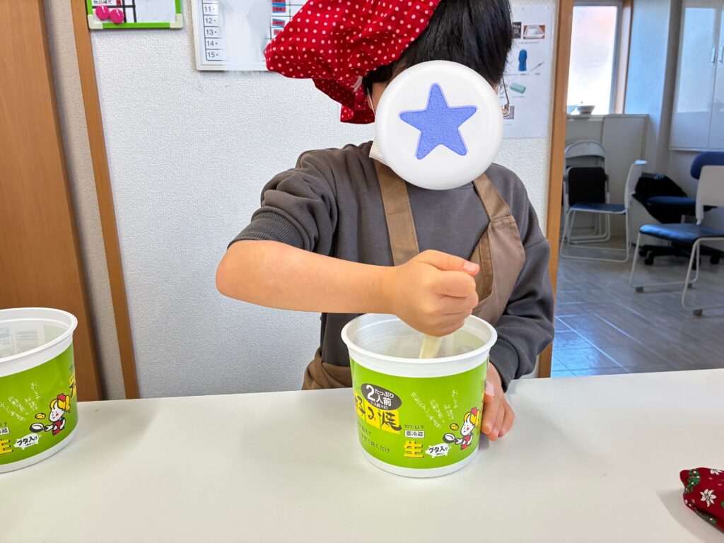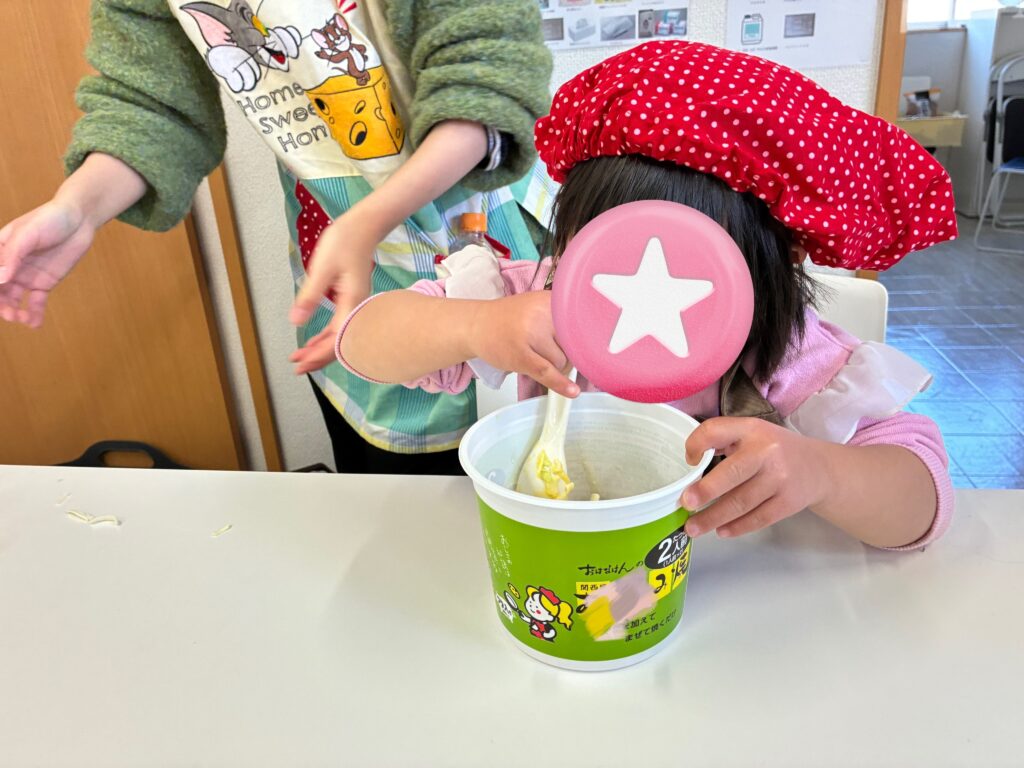 カップに入っている材料を、スプーンを使ってぐるぐる混ぜました!